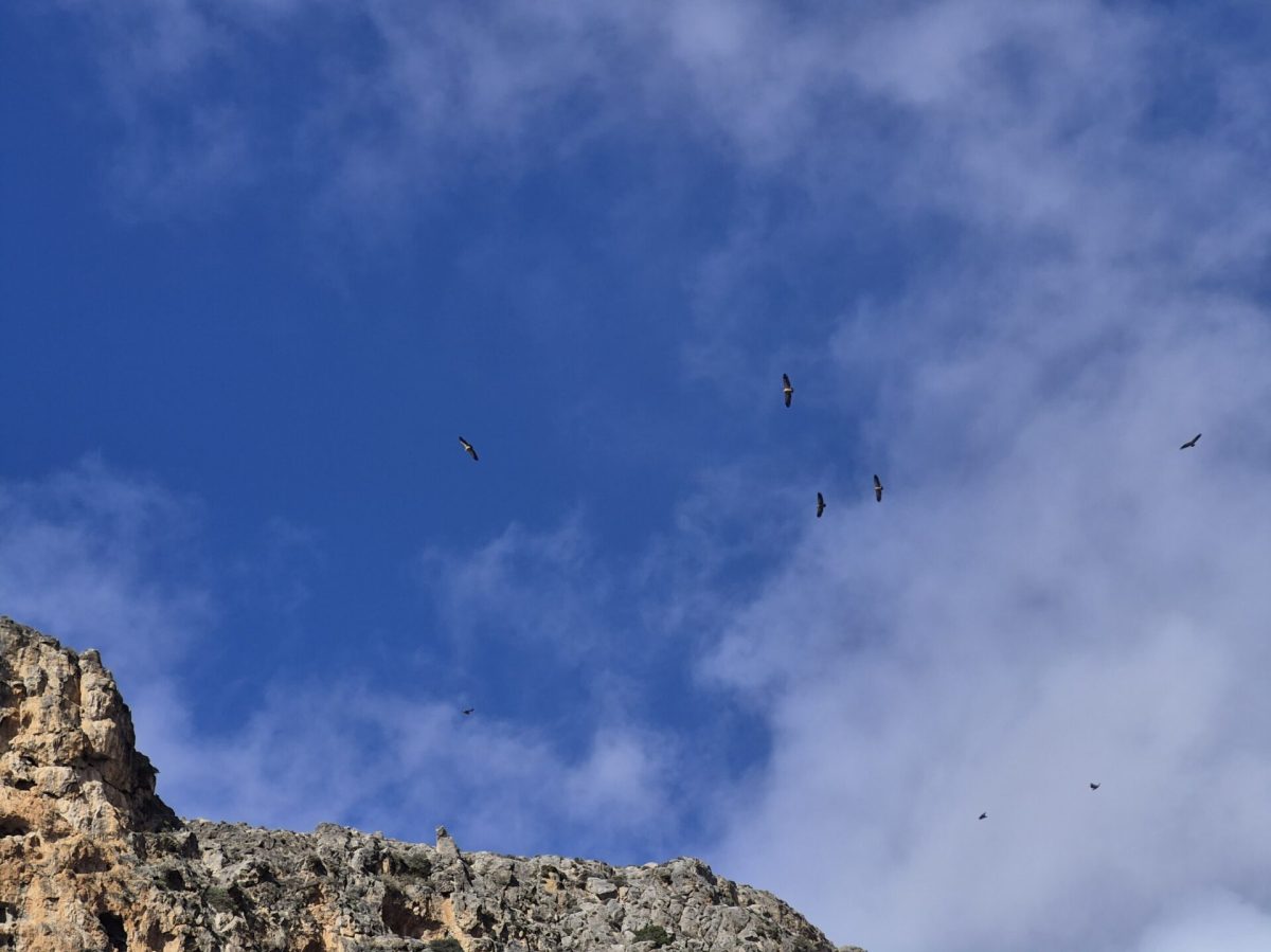 Seit 5 Jahren beobachte ich die Geierpopulation in der Pervolakia Schlucht zu verschiedenen Jahreszeiten. Immer wieder bin ich fasziniert von ihren Segelflugkünsten, sei im Hangflug, in der Thermik oder in Formationen. An diesem Tag flogen bis zu 15 Geier herum! Spannend ist auch zu schauen, in welchen Felsnischen sie ihre Nester haben. Üblicherweise sieht man im späteren Sommer oder Herbst dann ein Junges, das zuerst unschlüssig umherhüpft, bis es seine ersten Flugversuche wagt. Immer wieder ein grossartiges Spektakel!