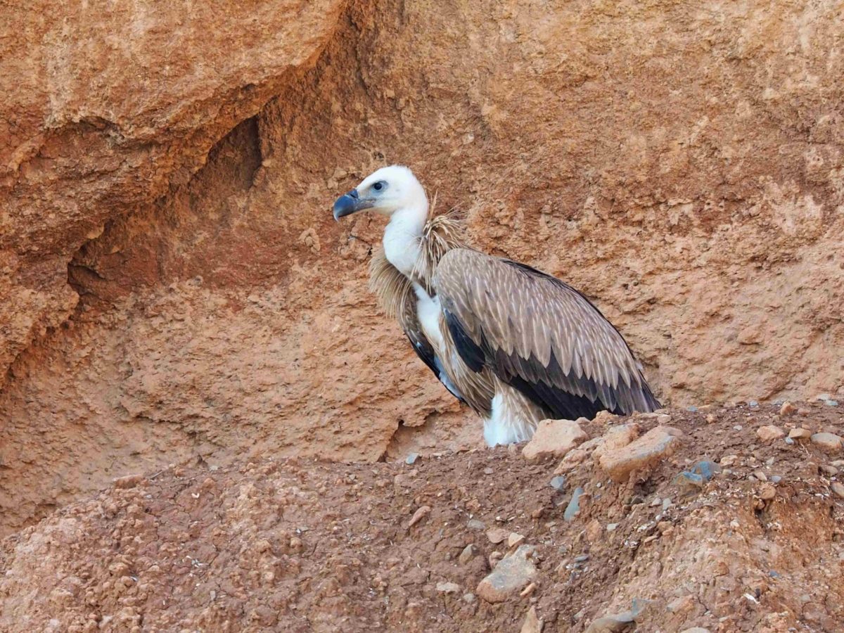 Sonntag 25. Januar 2026: Hast du schon je grasende Geier beobachtet? Nun ja, genau genommen haben sie kleine Büsche ausgerissen. Offenbar ist dies ein ziemlicher «Chrampf», denn der eine Gänsegeier mühte sich mehrere Minuten mit seinem kräftigen Schnabel ab, um das Gebüsch am Steilhang auszureissen. Danach flog er in die etwa 100 m entfernte Bruthöhle, wo offenbar ein neues Nest entsteht.